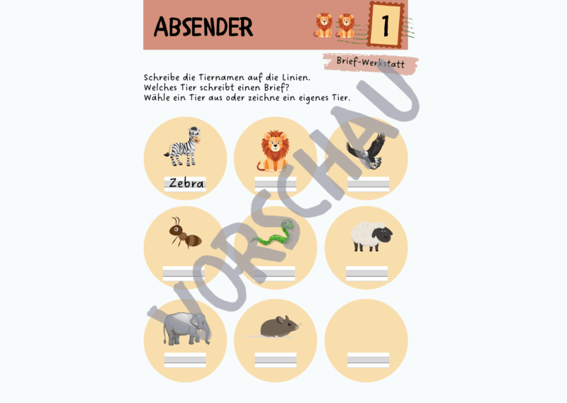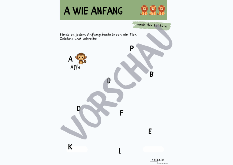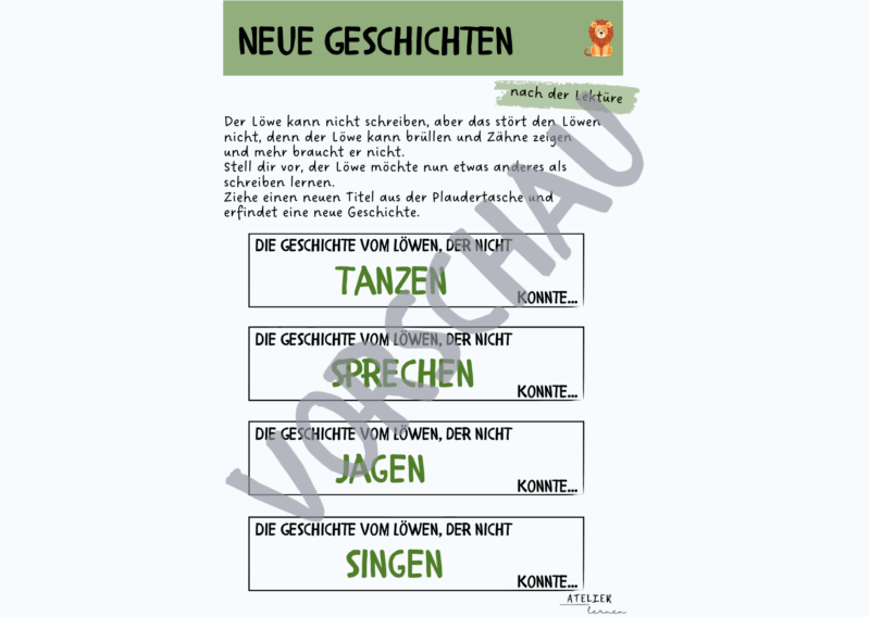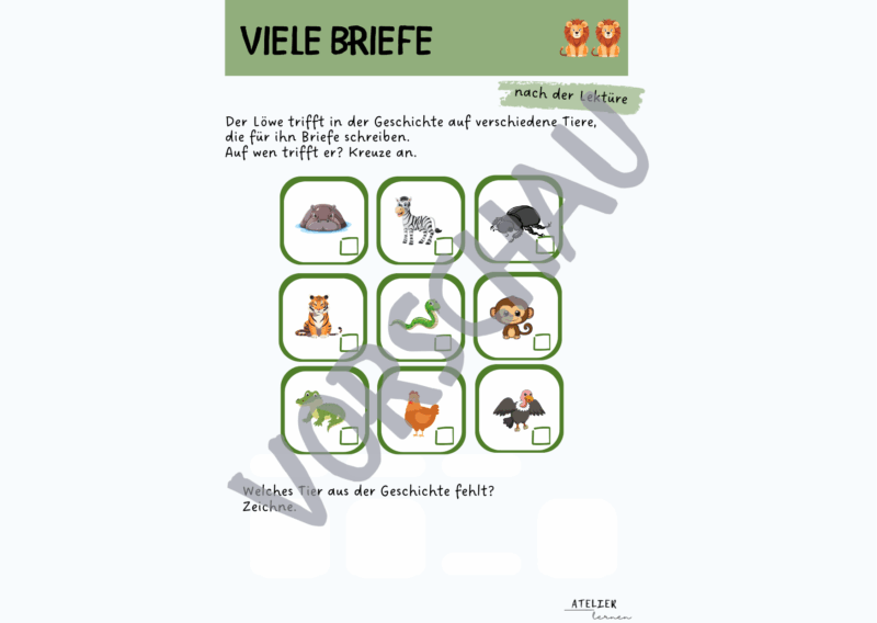 Bei einzelnen Angeboten stehen die Aufgaben in dreifach differenzierter Ausführung zur Verfügung und können je nach Lese- und Schreibentwicklung der Kinder ausgewählt werden. Die Anzahl der abgebildeten Tiere zeigen dabei den Schwierigkeitsgrad an. Je mehr Löwen abgebildet sind, umso anspruchsvoller ist das Lernangebot.