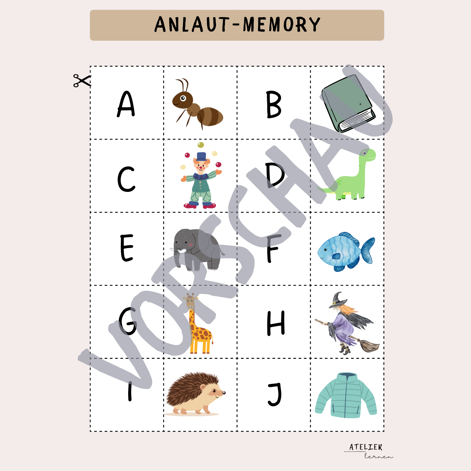 Dieses Produkt enthält ein Anlaut-Memory zu allen Buchstaben sowie Umlauten.