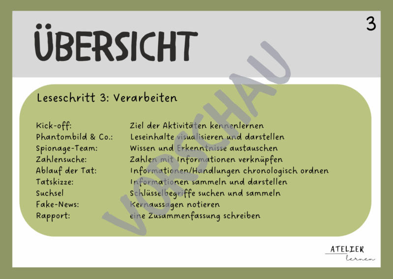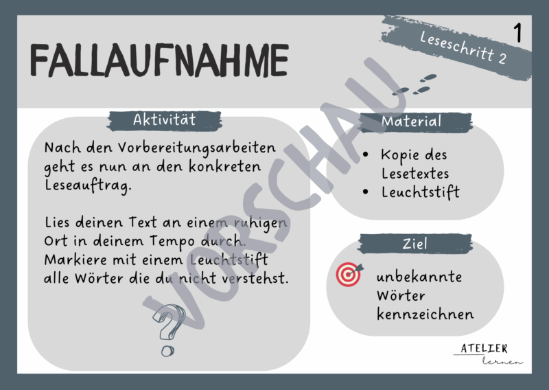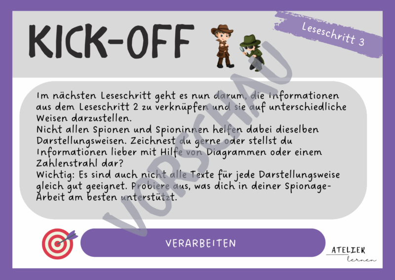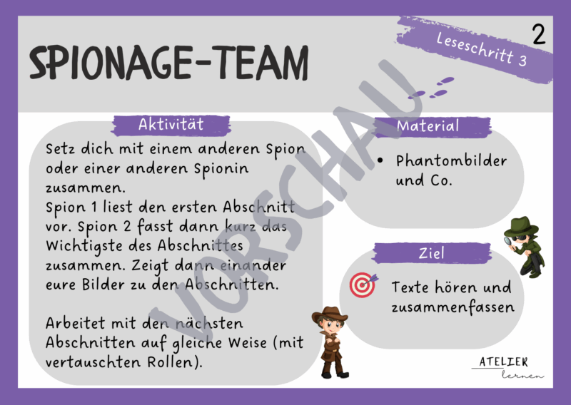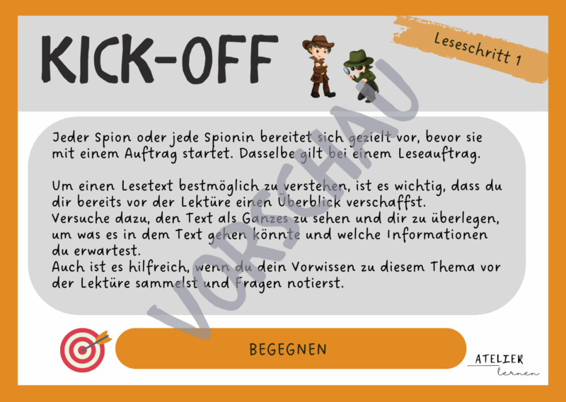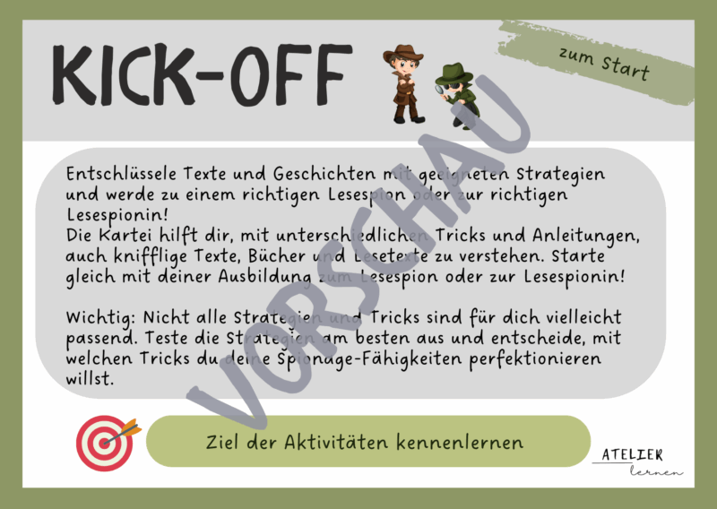 Mit dieser Kartei haben wir uns zum Ziel gesetzt, Ihre Schülerinnen und Schüler im Bereich Lesestrategien zu sensibilisieren und ihre Fähigkeiten mit einem abwechslungsreichen Spionage-Training zu fördern. Auf den folgenden Karteikarten erhalten die Schülerinnen und Schüler klare Aufträge, Impulse und Ideen zum Erlernen und Vertiefen von Lesestrategien.