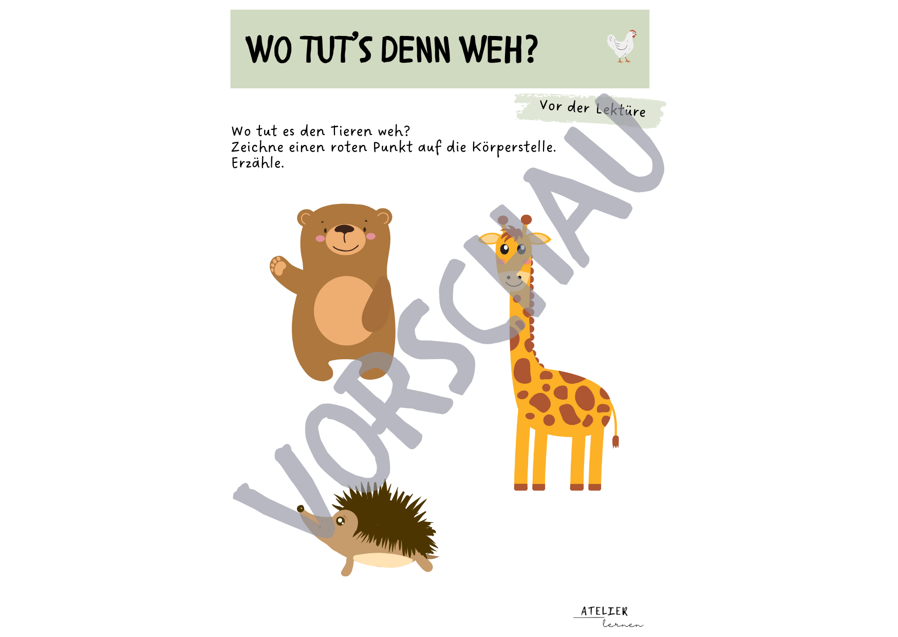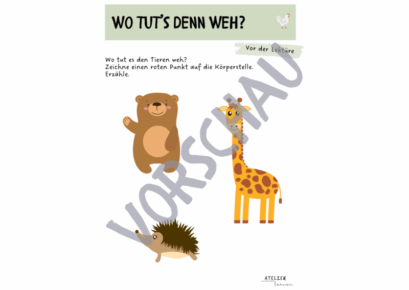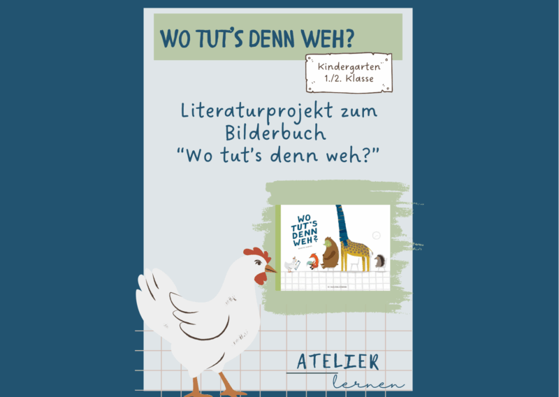 Das Buch “Wo tut’s denn weh?” thematisiert die Geschichte von Frau Dr. Huhn, die in ihrer Praxis verschiedenen Tiere gegen ihre Schmerzen hilft.