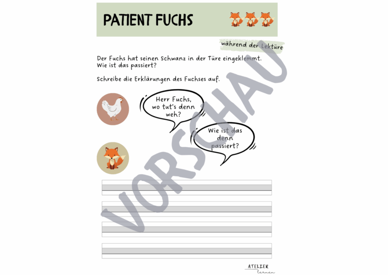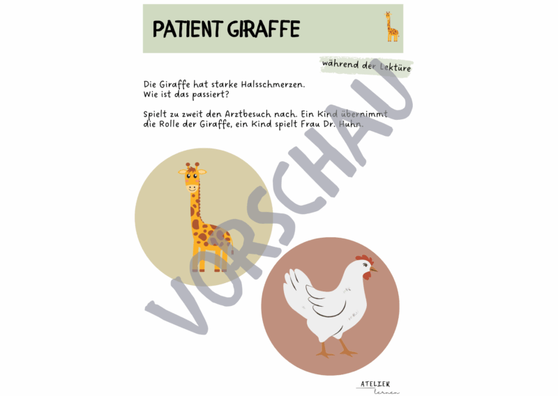Das vorliegende Produkt wird in sieben Teile eingeteilt. Im ersten Teil werden vor der Lektüre das Buchcover, die Titelseite, der Klappentext sowie erste Leseerwartungen thematisiert. Die darauffolgenden Teile thematisieren die einzelnen Tier-Patienten und ihren Arztbesuch bei Frau Dr. Huhn. Nach der Lektüre dürfen die Kinder dann einen eigenen Arztbesuch erfinden und nachspielen.